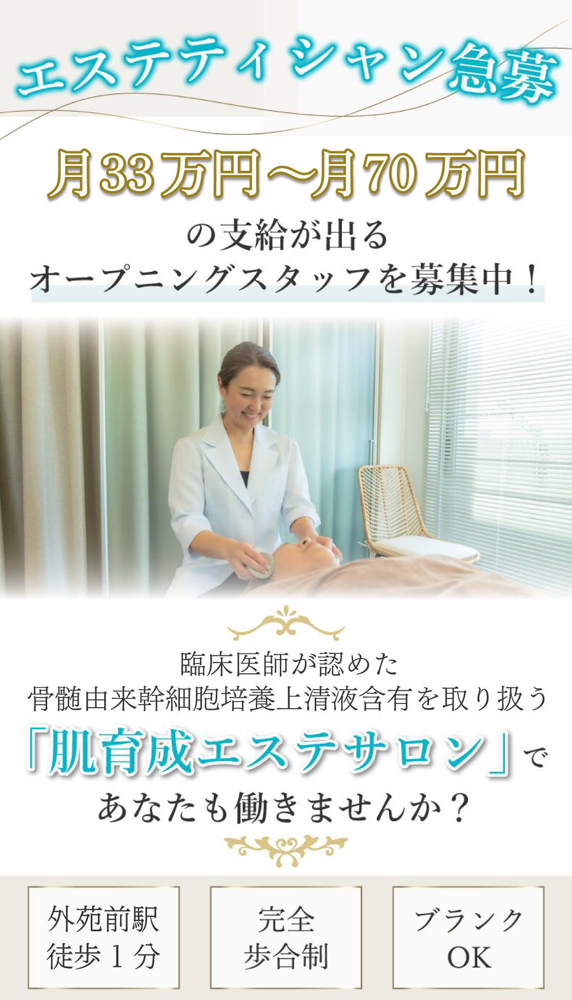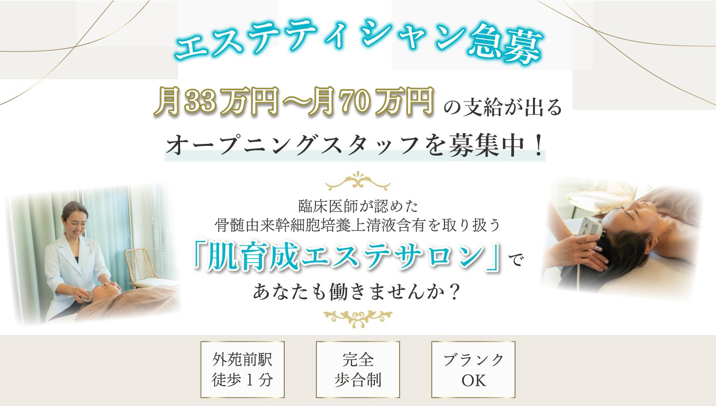 | 給与 | ◆完全歩合制:33.0万円〜80.0万円 ※上記は週休2日×フルタイム勤務の支給例です。 ◆完全歩合制…単価3.5万円 *技術手当:フリー25%・指名30% └売上から材料費を引いた額からバック *店販手当:10% <安心の保証給制度/入社後3か月間限定> *金額:日給平日1.1万円・土日祝1.5万円 *条件:フルタイムで勤務した日 ※歩合が日給を超えた日は、歩合額で支給します♪ ※当サロンのお客様の9割以上は「幹細胞エステ」となります。 <1人当たりの接客時間> ・ご新規様の場合:3時間 ・既存のお客様の場合:2時間〜2時間30分 |